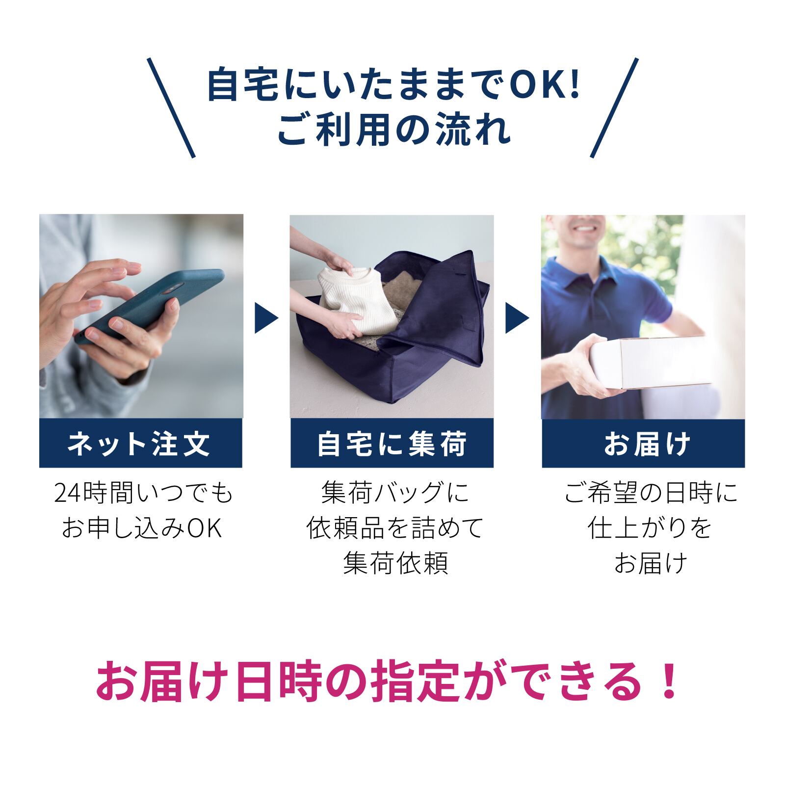 ・ご注文後に、集荷キットをお送りしますので衣類を詰めていただき、佐川急便に集荷依頼のご連絡をお願いします。